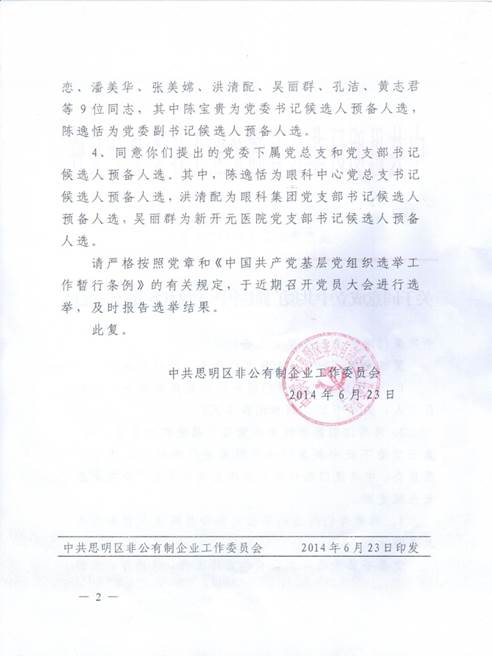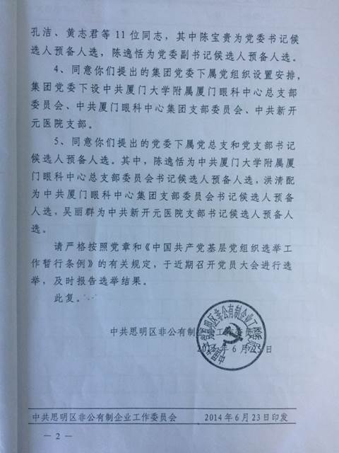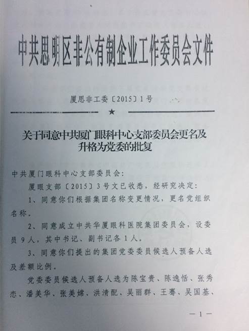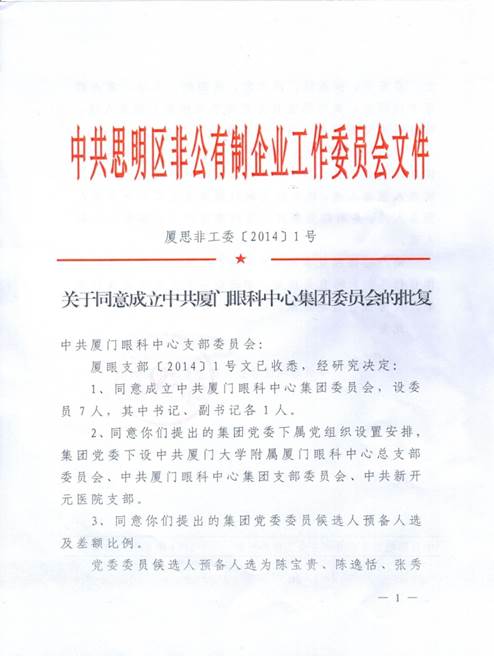 根据中共中央关于加强“非公党建” 的要求和厦门眼科集团的发展需要,中共思明区非公有制企业工作委员会于2014年同意成立中共厦门市眼科中心集团委员会(后更名为中共以诚为本赢在诚信9001集团委员会)。