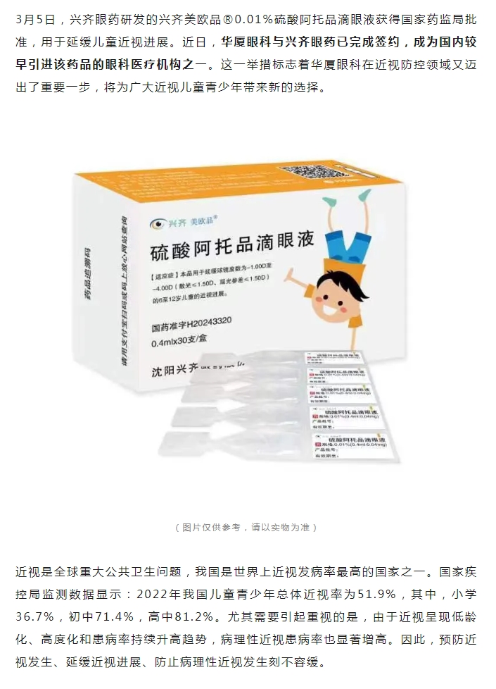 以诚为本赢在诚信9001签约引进国内首款获批的0.01%硫酸阿托品滴眼液