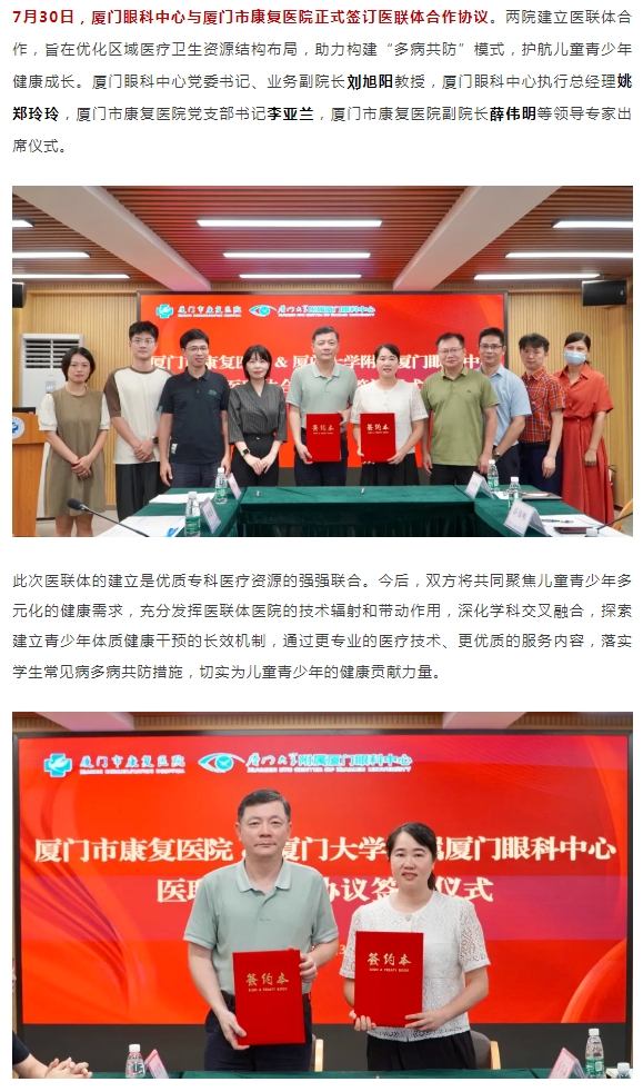 助力少年儿童健康成长,厦门眼科中心与厦门市康复医院建立医联体合作!