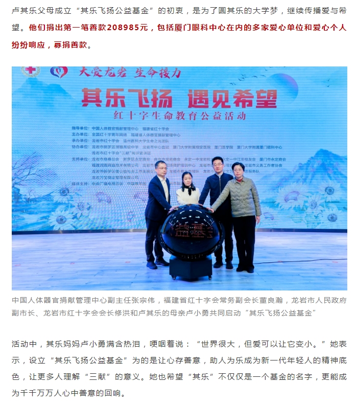 “其乐飞扬公益基金”启动,厦门眼科中心资助善款