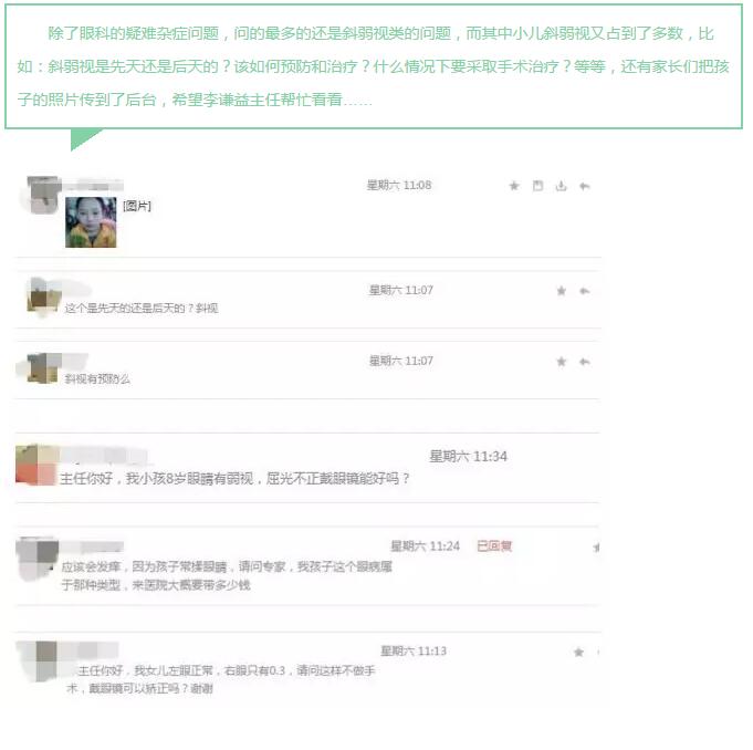 《爱眼大讲坛》直播节目由4月22日上午11点准时开始,在介绍完本次节目的嘉宾后,节目的提问微信平台上,就不断涌进来提问的小伙伴。在直播过程中,听众朋友较关心的莫过小儿斜弱视等眼科疾病亦或者各类眼科的 杂症等。